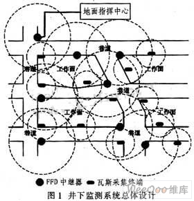 图1给出瓦斯监测系统的总体结构。它由地面监控中心、井下ZigBee传输网络和瓦斯采集终端等组成。其设计思想是利用不同的瓦斯采集终端对各采集点进行瓦斯采集,通过建立的Mesh无线通信网络将数据进行中继传输,逐级路由最终到达地面监控中心,实现动态显示、分析及其他处理。