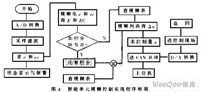 系统软件所实现的功能为:采样n时刻A/D转换输出值,与系统设定值和上次采样值e(n-1)比较得n时刻偏差e(n)和偏差变化率ec(n);选择合适的量化因子ke和kc,由相应的模糊化规则得到模糊值E(n)和EC(n);分析E(n)和EC(n)的变化趋势以确定是否加入积分环节。然后,根据E(n)和EC(n)的值直接查程序存储器内的模糊控制总表或进行积分运算得到模糊控制增量。最后,对加入或不加入的模糊控制增量采用最大隶属度原则进行模糊判决,选择适当的比例因子ku得到控制增量Δu,计算Δu+u(n-1)的值,即可得n时刻的控制量。该值可通过CAN总线传送给其它智能单元,进行D/A转换后即可控制现场设备或上位机做进一步的处理以协调整个系统各控制单元的正常、有效的运行。智能控制单元在处理以上任务的同时还要完成与CAN总线数据通信和对现场设备的状态显示与报警。由离线方式计算出的模糊控制总表可以直接以矩阵的形式写入芯片内部程序存储器,其软件设计流程如图4所示。