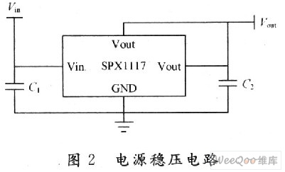 由于核电站的特殊性,对于某些部位的取电很方便,因此采取双节点的方法,即信号采集节点与汇聚节点Ⅲ。节点的设计如图1所示,由传感器、微处理单元、通信模块、电源模块组成。信号采集节点用普通高能干电池供电,而汇聚节点则采用干电池与220 V双电源设计方案(如图2所示),220 V的电压经过低压变压器降压至5 V左右,整流后输入到Vin,经过SPX1117稳压电路以后,就可以在Vout输出3.3 V的稳压电。这样的话,可以大大增强汇聚节点的运算能力,最大限度地延长网络的工作时间。同样信号采集节点的干电池也可以采用这种稳压方式。