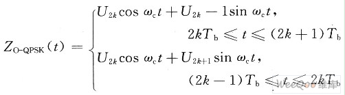 CC2420采用O-QPSK调制方式,图4为O-QPSK信号产生电路,Tb/2的延迟电路是为了保证I,Q两路码元偏移半个码元周期。BPF的作用是形成QPSK信号的频谱形状,保持包络恒定。O-QPSK信号的数学表达式为: