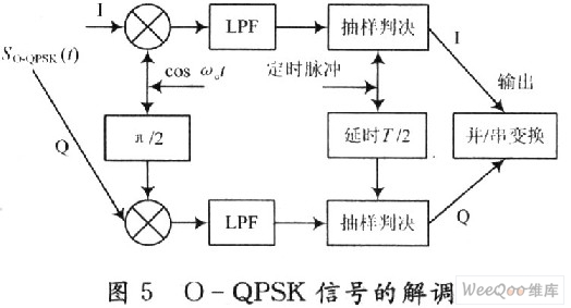 OQPSK信号可以采用正交相干解调方式解调,如图5所示,Q支路在时间上偏移了Tb/2,所以抽样判决时刻也应偏移Tb/2,以保证对两支路交错抽样。由此可以看出,O-QPSK克服了180°的相位跳变,信号通过BPF后包络起伏小,性能得到了改善,由此受到了广泛重视。利用此芯片开发的无线通信设备支持数据传输率高达250 Kb/s,可以实现多点对多点的快速组网。