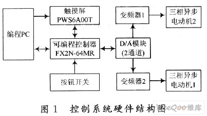 控制系统硬件结构主要包括:可编程控制模块、控制指令输入模块、D/A转换模块、变频器调节模块。