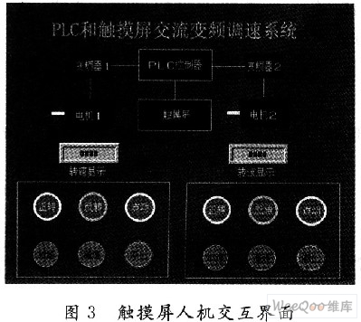 Hitech ADP编程软件对编程PC机要求不高,利用触摸屏自带RS 232串口或者USB接口通信,将设计完成后的人机交互界面下载到触摸屏。对于两台电动机分别设计了正转、反转、点动、加速、减速、停止以及速度显示控键,可由相应的控键实现对电机运转状态的控制和监控。触摸屏上电后自动进入所设计的画面,操作人员可以根据需要直接通过人机交互的方式,对下位机PLC进行控制。人机界面如图3所示。
