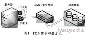 本FC加密卡主要用于采用光纤通道技术的FC-SAN中,可安装在存储服务器上的FC HBA卡和交换机/磁盘阵列FC接口之间。主要功能是完成进出磁盘阵列的SCSI数据的加解密。FC加密卡的加密密钥采用USB KEY并以密文的形式注入,以配合主机输入的解密密钥将工作密钥解密。同时也可以根据主机设定的控制策略,对进出磁盘阵列的有效数据进行加解密。本加密卡的应用方式如图1所示。