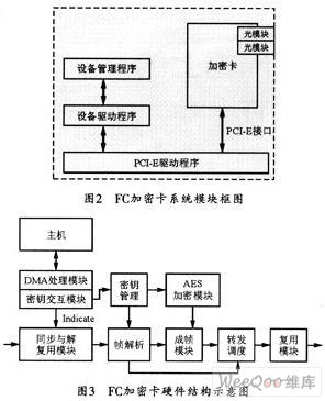 FC加密卡系统的总体结构如图2所示。该加密卡包含一块加密卡硬件和相应的驱动程序以及设备管理程序,同时包含2个2 GB的FC光收发模块,可用于连接HBA卡和磁盘阵列。此外,该加密卡还可通过PCI-E接口连接到计算机主板,然后通过设备管理程序完成设备状态的检测、显示和日志记录等功能。密钥的注入也是设备管理程序的工作,而驱动程序则可用于完成与下层驱动程序的接口功能。本FC加密卡硬件的总体结构如图3所示。本加密卡主要由三部分组成:光收发器、大容量FPGA和外围附加电路。其中光收发模块可完成光电信号的转换功能,设计时可采用最高能支持2 Gbps的FC用光收发模块,该模块支持热插拔,所以可将其中的一路光收发模块与服务器的HBA卡光接口相连,而将另一路与磁盘阵列的光接口相连。