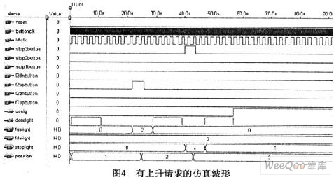 模块(一): 图4所示仿真的是在第二层电梯外部有上升请求,也就是f2upbuttton信号的一个脉冲,可以看到电梯从一层上升到二层,position信号由1变到2,doorlight信号‘1’表示开门,‘0’表示关门。当乘客进入电梯以后,在电梯内部要求上升到第三层,也就是stop3button产生一个脉冲,电梯上升到第3层,开门4秒以后关门,停留在第三层,position最后的值为3。在仿真图中看不到buttonclk,只显示为一条黑色的线,是因为采用了频率较大的时钟。