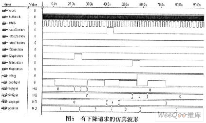 模块(二):图5是有下降请求的情况,它是图4的继续,当电梯停留在第三层的时候,在电梯外第二层有下降请求,这时候fdnlight信号灯由0变为2,说明第二层有下降请求。电梯下降到第二层,响应了下降请求,所以fdnlight信号灯清0。这时候,在电梯内部没有停留在哪层的请求,所以电梯就停留在第二层,position信号的值保持在2。