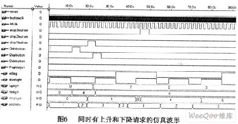 模块(四):图7所示的仿真,原先电梯停留在第一层,电梯外第三层有下降请求,电梯上升到三层,乘客进入电梯以后要求下降到一层,此时,二层有下降请求,接着又有上升请求,电梯首先在二层停留。然后下降到一层。随后要响应二层上升请求,上升到二层,乘客进入电梯以后要求上升到三层,所以电梯最后的停留位置在三层。