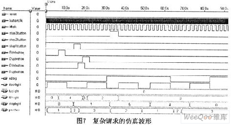 在本设计中,因为考虑了扩展性,所以在信号定义的时候就使用了二进制的向量,而不是整数。在设计方法上也做了特殊的设计,所以使得扩展性较好。如果要实现n层电梯的控制,首先在端口的地方就要加入所有的按键,而指示灯只要把向量中的3改成n就可以了。同时需要在按键控制进程里加入其他按键触发指示灯的语句。在电梯的升降状态将3改成n,在电梯的开门状态中将2改成n一1,在关门状态,将position=3改成position=n,关键是修改position=2的部分,如果按照每层罗列,将十分烦琐,所以得寻求各层判断条件的共性,解决方法之一就是,新建一个全局向量one为std—logic—veoter(n downto 3)应改写成0,然后和stoplight与fuplight向量比较,如果有更高层次的请求,那么stoplight或fuplight向量,如果stoplight和fuplight向量都小于one向量,表示没有更高层次的内部上升请求,此时将fdnlight向量和one向量比较,如果大于,则表示高层有下降要求,电梯得上升。如果没有任何请求信号,则电梯停止,否则电梯下降。如此就可以大大简化程序,但是要注意的是one向量必须实时更新,以作为判断依据,可以另外写一个进程,用buttonclk来触发。