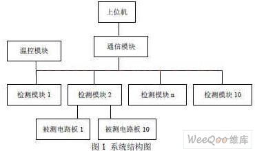 图 1 系统结构图在本系统中,每个检测模块最多可同时检测 10块电路板,共有 10个检测模块,因此,整个系统在一次老化检测过程可以同时检测100块电路板。检测模块将检测的数据通过 CAN通信送给通信模块,由通信模块通过串行通信发送给上位机,由上位机软件对检测数据进行解析,判断被测电路板的工作状态,显示每一块被测电路板的工作状态,存储每块被测电路板的检测数据,生成历史报表。上位机软件还向操作员提供良好而方便的人机交互界面,操作员通过该界面,可以设置系统老化的时间、温度与测试模式。
