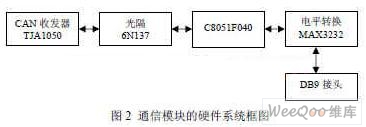 通信模块在老化系统中处于核心地位,它完成两方面的任务:一方面,通过串行异步通信与上位机通信,接收用户通过上位机发来的控制命令,向上位机发送检测的数据。另一方面,通过 CAN通信方式与 10个检测模块及 1个温控模块通信,向检测设备发送命令和采集数据。通信模块的硬件系统框图如图 2所示。