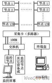 曙光4000A大规模机群监控系统从硬件上分成四部分,包括节点卡、采集卡(多路器)、监控屏幕、终端机等四个部分。整个系统架构如图1所示: