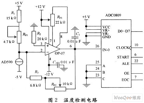 硬件电路采用双点温度调整误差,电路如图2所示。放大器采用OP-07单片精密运算放大器,它具有低噪声、低漂移和高增益特点,是一种通用性强的运算放大器。电容C4在此起滤波的作用。通过R1给AD590传感器提供稳定电压,所测温度由AD590温度传感器检测,给电压放大器提供电压信号,以供放大。这里用电位器RP1起到调零点的作用,电位器RP2起到调增益的作用,通过调整运放中的电阻RP1和电位器RP2,找到输出电压与被测温度的合适对应关系。