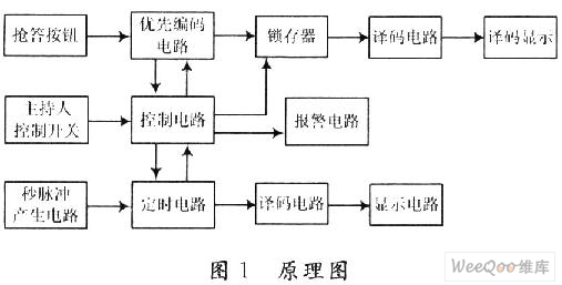 (1)图1为数字抢答器为总体方框图。其工作原理为:接通电源后,主持人将开关拨到“清除”状态,抢答器处于禁止状态,编号显示器灭灯,定时器显示设定时间;主持人将开关置“开始”状态,宣布开始抢答器工作。定时器倒计时,扬声器给出声响提示。选手在定时时间内抢答时,抢答器完成:优先判断、编号锁存、编号显示、扬声器提示。当一轮抢答之后,定时器停止、禁止二次抢答、定时器显示剩余时间。如果再次抢答必须由主持人再次操作“清除”和“开始”状态开关。
