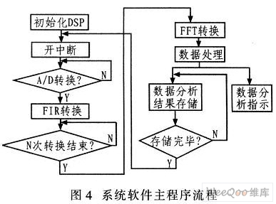 图4为系统软件主程序流程。首先对系统初始化,看门狗定时复位,启动A/D转换器采集数据,主程序进入死循环;当A/D转换器转换完毕,进入中断子程序,读取数据,并将数据存人数组进行数据的处理和缓存。