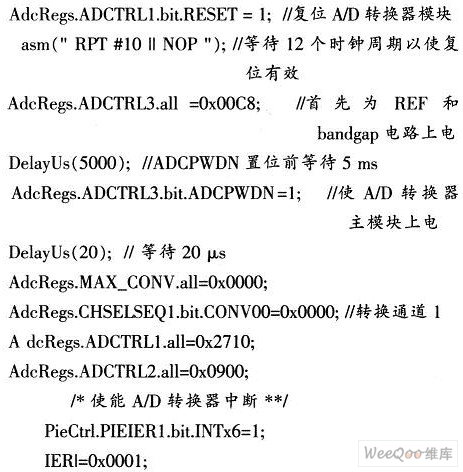 EVA为SEQ1产生ADC SOC信号后,开始对通道1转换,转换结束后,A/D转换产生中断信号并调用中断处理程序读取ADCRESULTO中的值存人数组。当采满512个点后将程序跳转到数据处理程序,调用FIR和FFT子程序,其中DSP A/D转换器初始化程序代码为: