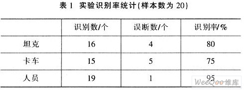 为了检验系统的实际应用能力,将该系统在震动台上进行实验,将3028型传感器固定在激震台上,用激震台分别模拟坦克、卡车和人员3种震动信号,这3种信号各取20组用于该系统实验,根据实验输出信号判断识别的正确率,在震动台达到稳定后DSP的解算时间均小于1 s。DSP解算识别结果如表1所示。