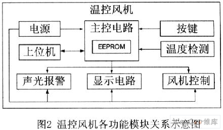 根据设计要求,我们对风机控制系统采用模块式设计方案,把整个风机温控系统分为九个功能模块,即:电源模块、风机控制模块、主控电路模块、显示电路模块、按键模块、报警模块、温度检测模块、EEPROM模块、串口通信模块等。各功能模块之间的关系如图2所示。