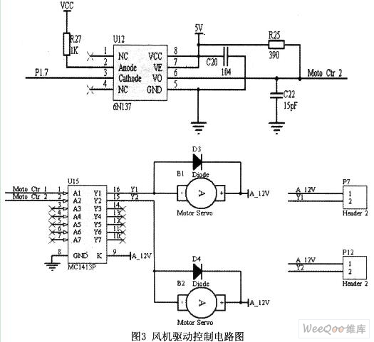 (2)风机控制模块(风机控制采用主备方式)该模块使用1个单片机IO口输出PWM信号,通过光耦和MC1413驱动电路控制风机的停开和转速,风机供电采用12V电源直接供电。电路图见图3所示。