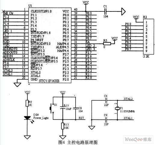 器件需求:STC1 1F16XE芯片,11.0592MHz晶振,22PF\1OuF\104电容,1K\10K电阻,复位按键1个。原理图如图4所示。