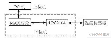 本文中,下位机由嵌入式系统组成。根据实际需要,其核心采用了低端的LPC2104芯片。它包含一个支持仿真的ARM7TDMI-S CPU,128K 字节FLASH存储器和64K字节SRAM以及片内总线。数字式温度传感器DS18B20连到LPC2104的一个GPIO管脚P0.8上。LPC2104通过该管脚发送命令和接收温度值,并对读到的温度值进行数字滤波、二—十进制转换等数据处理,还设置了温度超限报警等功能。下位机还可与上位机实时通信,一方面接受上位机的各种指令,另一方面,将测得的温度值传送到上位机。