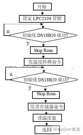 通过对DS18B20进行时序分析知,复位脉信号应为一个持续480us以上的低电平信号;写信号应满足:先使DQ线降为低电平,若写“1”,则在15us内置DQ为高电平,若写“0”,则仍置DQ为低电平,在两次独立写时序之间至少应保持1us的恢复时间;读信号应满足:先将DQ线从高电平拉到低电平,并使其至少保持1us,因DS18B20的输出数据将在下降沿后15us有效,故在此之前,微机必须释放DQ线,以便读取数据。写、读时序均不得小于60us。根据以上分析,可编写出相应的复位和读、写函数,调用这些函数便可实现对DS18B20的操作。温度测量程序流程见图2,相应的温度测量函数为Measure_Temperature()。