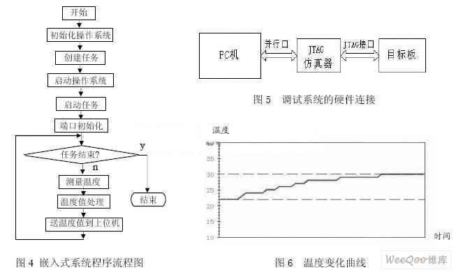 在TaskStart任务循环开始前,先进行初始化工作,如调用中间件函数URAT0Init(9600)初始化串口、设置P0.8为GPIO等。然后,在任务循环中调用温度测量函数Measure_Temperature()和串口发送函数URAT0Putch(uint16 data),实现温度的测量并将温度值传送到上位机。嵌入式系统程序总流程见图4。