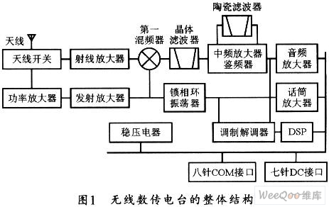 图1所示是一个无线数传电台的整体结构图。现在国内大部分的遥控遥测电台都是用模拟调频对讲发信机(即车载电台)加MODEM芯片改制而成的。它不是专业的数字数据传输设备,而是工作于230 MHz/800 MHz数传业务频段和350 MHz/800 MHz集群业务频段的对讲机。这种方式在国外早已淘汰。用这种电台传输数据存在着可靠性差、性能指标低、误码率高、灵敏度低、无网管等缺点。如果数据传不回来或控制不能下达,它将无法判断是停电、电源坏、信号差、天线馈线不匹配、温度高还是PLC//RTU无数据。因此,在要求高速度、远距离、高可靠性的传输中,则应当采用本文给出的基于DSP (Digital SignalProcess-ing)等技术的数传电台。而美国MDS公司以及DATAIANC等厂家的设备,也具备这些功能。
