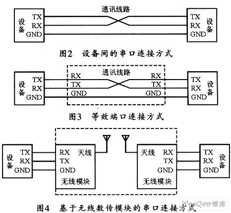 对比图3与图4可以看出,如果将两个无线模块组成的无线信道也看成是一个两端口的设备,则对设备A与设备B而言,串口通讯时有线连接与无线连接的端子的对应关系是一样的。