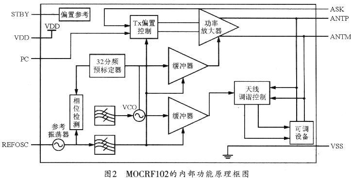 图2为MOCRF102的内部功能原理框图,它主要由UHF合成器、缓冲器、天线调谐器、功率放大器、TX偏置控制、偏置参考以及调节电路等组成。