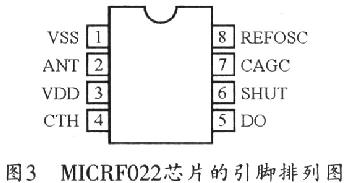 MICRF022采用8引脚SOIC封装,图3所示为MICRF022的引脚排列图。