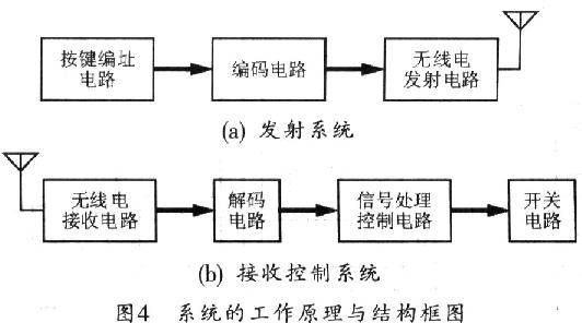 系统工作时,首先通过按键编址电路输入所需控制电路的位号,同时启动编码电路,指令编码电路在内部电路的控制下将产生带有地址编码信息和开关状态信息的编码脉冲信号,该信号对无线电发射电路进行调制,再通过无线电发射电路将该信号发射出去。无线电接收电路则可将接(b)接收控制系统收到的编码脉冲信号通过解码电路进行编码地址确认,以确认是否为本遥控开关系统的地址。如果是,则对接收到的信号进行译码,同时指令译码电路输出有效数据信号,并经过信号处理控制电路和控制逻辑发出对应的控制指令。如果不是,解码电路则不解码,指令译码电路也不译码,信号处理控制电路不响应,开关电路无任何动作。