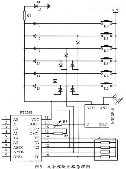 按键编码电路采用二极管组合逻辑开关阵列来实现对受控电路开关进行编址,其中指令编码电路采用编译码芯片组PT2262。PT2262的A口是地址码设置口,D口是数据码设置端,分别和二极管组合逻辑开关阵列的逻辑输出相连,数据从000~101有6种状态。发射模块电路中采用的射频芯片为MICRF1020当编码芯片PT2262的数据输出端无信号输出时,MICRF102不工作,发射电流为零,而当PT2262的控制端有效时,输出的串行脉冲信号对MICRF102进行调制发射,通过调制电阻R2可调整发射电流,从而调整发射距离,较小的R2取值可提高发射距离,而增加二极管开关阵列则可将系统扩展成为多路遥控发射模块。