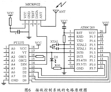 接收控制电路主要由无线电接收电路、指令译码电路、信号处理与控制电路和开关电路组成。无线电接收电路采用与射频发射模块MI-CRF102相配套的射频接收模块MICRF022来实现,MICRF022具有较宽的接收带宽,功耗极低,可长期处于待机状态。MICRF022的输出端口直接与译码芯片PT2272的数据输入端口相连接,当接收端的地址码和发射端的地址码设置完全相同时,译码芯片输出端才有输出信号,以将输出信号与无线电发射电路相对应的开关信息送给信号处理控制电路,由控制电路控制相应的开关动作,否则,译码芯片不译码,信号处理控制电路不响应,开关电路也无任何开关动作。信号处理控制电路采用AT89C2051单片机来实现对输入信号的处理和对开关电路的控制。