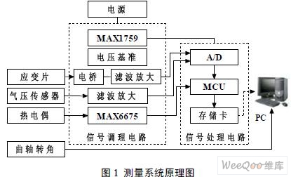 系统由传感器、电源、信号调理电路、信号处理电路和PC 机组成在实际测量时,传感器安装在运动 件上,由于采用引线装置传递信号会限制机械部件的运动,因此可采用无线收发电路传输数据,也可采用 存储方式进行数据采集,即先把数据保存到存储卡,数据采集完之后再拿出存储卡读入到计算机,测量系 统原理如图1 所示。