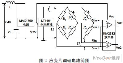 应变片调理电路由升压芯片(为芯片提供工作电压)、电压基准(稳压)、电桥、滤波、放大等部分 组成,如图2 所示。