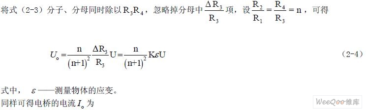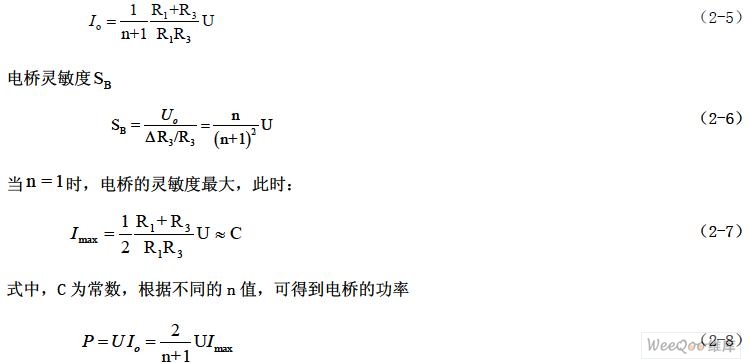 由式(2-6)可见电桥的电源电压U 越大,电桥的灵敏度也就越高,U 取决于组成电桥的电阻元件允许 通过的最大电流。但是,由式(2-8)可见,当电桥的电源电压U 越大,电桥的功耗就越大,因此应该选 择合适的供电电压。