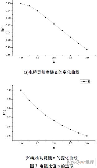 电桥的供电电压确定后,根据式(2-7)和式(2-8)前的系数可以分别做出如图3(a)和3(b)的 曲线图,他们分别反应了电桥灵敏度和功耗随n 值的变化,可以看出,当n=1.5 时,电桥的功耗减少了20 %,而电桥的灵敏度仅下降了4%,因此,设计电桥时取n=1.5,既降低了功耗,又保证了电桥的灵敏度。 此时可得4 R = 525Ω ,同时可选取1 R =2KΩ , 2 R =3KΩ 。