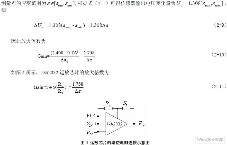 确定了R7 的值后,即可根据式(2-10)计算R8 的值,然后从标称系列选择最接近该阻值的电阻。此 处选R = 5.1KΩ 7 ,根据连杆上的应变,可选R = 360KΩ 8。
