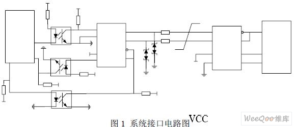 本系统通信机制的提出以高效、可靠为目的。RS-485 为半双工结构,现场中比全双工往往更接 近于实用,在此采用只有2 条信号线的简易型连接。系统接口电路图由图1 所示,主保护模块上 的8051 单片机输出的TTL 逻辑电平通过光电隔离后,由MAX485 芯片转换为RS-495 电平,再由面 板模块上的MAX485 芯片转换为TTL 逻辑电平,由8031 单片机读取。在8051 单片机一侧,使用并 行输入输出口2 的一位P2.7 对MAX 输入使能端RE、输出使能端DE 进行控制。由图1 可知,当P2.7 输出高电平时,RE 使能,单片机一侧接收数据;当P2.7 输出低电平时,DE 使能,单片机一侧发送数 据。这样,避免了盲目发送造成的数据叠加丢失现象,通信质量高,通信速度也能得到保证。