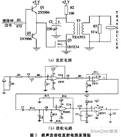 发射电路如图3(a)所示。发射电路将接收到的方波脉冲信号送入乙类推挽放大电路,用其输出信号驱动CMOS管,接着将其脉冲信号加到高频脉冲变压器进行功率放大,使幅值增加到100多伏,最后将放大的脉冲方波信号加到超声波换能器上产生频率为125 kHz的超声波并将其发射出去。