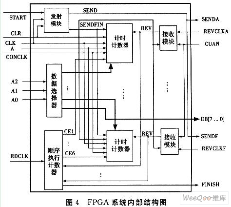 所有的接收模块接收完数据后,通过与非门及非门输出高电平(FINISH端口),以触发单片机使单片机处于接收数据状态,单片机发出信号使顺序执行计数器开始计数,计数值每次加1,输出端口便是相应的计时计数器,单片机便从相应的计时计数器中读取计数值。数据选择器与顺序执行计数器完成计数值数据的读取。