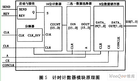 计时计数器模块主要完成测量脉冲发出去到接收到的时间间隔和脉冲的计数,主要由启动与关闭计数器控制、12分频器、16位计时计数器、二选一数据选择器及8位数据锁存器组成(见图5)。接收模块主要接收回波信号和关闭计数器,当接收模块接收到信号以后,便启动计数,达到计数值,就输出高电平,用来关闭计时计数器停止计数。为防止信号串扰,在信号发射时,CUAN端输入高电平,对其信号进行屏蔽。