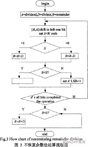 因此,当在某一步中,余数R为负,无需再加上除数D来恢复成原来的余数,只需在下一步中把恢复余数法中的减去除数D改成加上除数D,这种算法称为不恢复余数法。恢复余数除法需要2个步骤来确定1个商位,而不恢复余数法没有这个缺点。