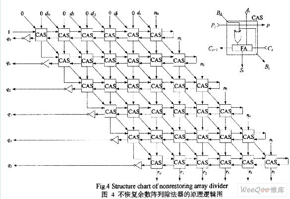 在除法中所需要的部分余数的左移可以用余数保持固定,而用除数沿对角线右移的等效操作来代替。如图4所示,不恢复余数阵列除法器可以用一个由可控加法/减法(CAS)单元所组成的叠接阵列来实现。不恢复阵列每一行所执行的操作究竟是加法还是减法,取决于前一行输出的符号与被除数的符号是否一致(最上面一行所执行的初始操作通常是减法,因此最上面一行的控制线P固定置成‘1’。当出现不够减时,部分余数相对于被除数来说要改变符号。这时应该产生一个商位‘0’,除数首先沿对角线右移,然后加到下一行的部分余数上。当部分余数不改变它的符号时,即产生商位‘1’,下一行的操作应该是减法。
