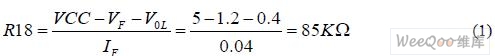1) 光耦外围参数确定见图2,以R18、R20 计算为例,由于光耦最小驱动电流IF=40μA,所以按式(1), (2)求解。