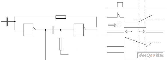 由于AD7714 数据更新完成后,其DRDY 线要送一个触发高脉冲,其宽度为203.5μs,而光 耦最小响应脉宽为500μs,因而必须设置脉宽展宽电路。原理分析,设原始状态时,图中a、 c 和d 点为逻辑低电平;b、e 为高电平,当VI 脉冲到来时,b 点跳到2VCC,随后放电至 VCC,c、d、e 点不变。当VI 负跳变沿到来时,b、c、d、e 各点翻转,然后C21 开始放电, 当d 点电位降到反相器转换电压值时,反相器状态转换,e 点变为高电平,并对C13 充电, 当b 点电位升到反相器转换电压值时,反相器状态转换,C 点变为低电平,从C 点引出稳态 脉冲。