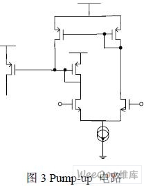 本文创新点:采用 pump-up 结构锁相环,通过加一个正反馈放大器,加快了电荷泵开 启速度;电荷泵开关 MOS 管在饱和态时进入截止区,所有的沟道电荷将流入MOS 管的源 端,漏端不受影响,有效地消除了电荷共享现象。
