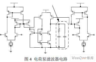 图 4 所示的是完整的电荷泵,环路滤波电路,在设计时,根据PMOS 和NMOS 的沟道 迁移率相应调整MOS 管宽长比,使PMOS 管和NMOS 管延时相同,同时,增大电流镜MOS 管的宽度,使充放电电流完全匹配,消除了电流失配的影响。