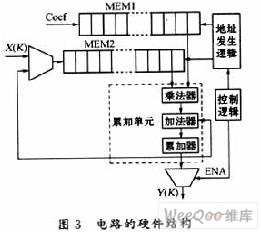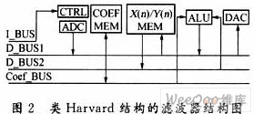 图2*包含一条指令流,三条数据流。指令流用于配置滤波器的和实现滤波器的读写控制;数据流的D—BUS1用于Y(n)的写回,D—BUS2用于X(n)、Y(n)的读出,Coef—BUS用于滤波器系数的写回和读出。因为系数存储单元和X(k)、Y(k)存储单元都采用双端口SRAM,所以,可同时进行读、写操作。